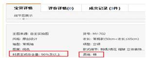 目前T恤面料主要有纯棉和涤棉两种,基本上卖家宝贝页面都会有介绍,买家在选择的时候可以看下材质的成分,如果没有具体介绍,也可以通过旺旺向卖家咨询清楚后购买,下图是参考页面: