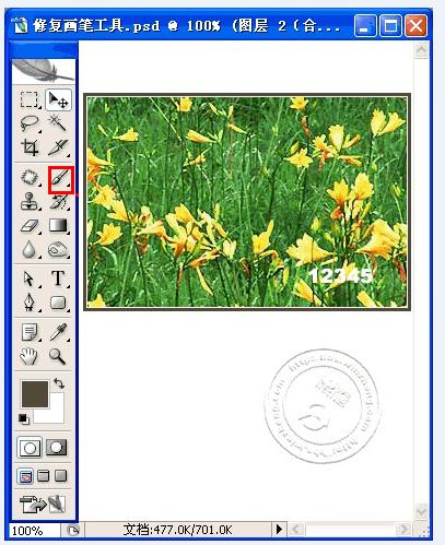 修复画笔工具的操作方法与仿制图章工具相似。按住Alt键,在无文字区域点击相似的色彩或图案采样,然后在文字区域拖动鼠标复制以覆盖文字。修复画笔工具与修补工具一样,也具有自动匹配颜色的功能,以达到和周围颜色混合的效果,可根据需要进行选用。如下图: