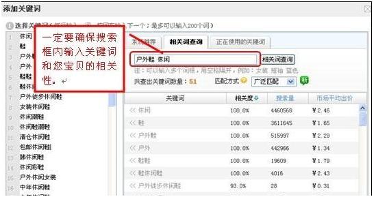根据后台系统推荐结果的相关度、搜索量和市场平均出价三个指标挑选合适的关键词是最简单也是使用人数最多的方法。不过需要注意的是一定要选择跟自己类目相同的关键词,否则会事倍功半,而且容易被认为作弊。 还可以使用手动查询相关关键词的方法。