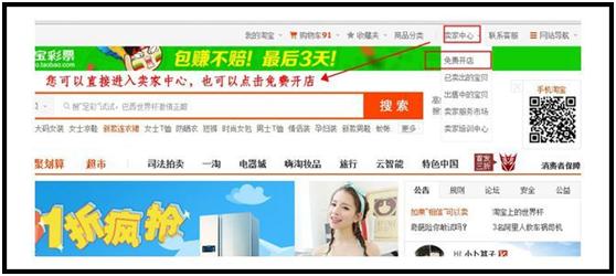 1.点击淘宝网首页导航条右上方的“卖家中心”或直接点击“免费开店”,如下图: