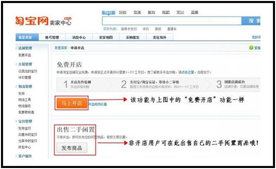 2. 如果是点击"卖家中心"的,进入页面后,可点击左侧导航条的"我要开店"或右侧导航条的“马上开店”,如下图:
