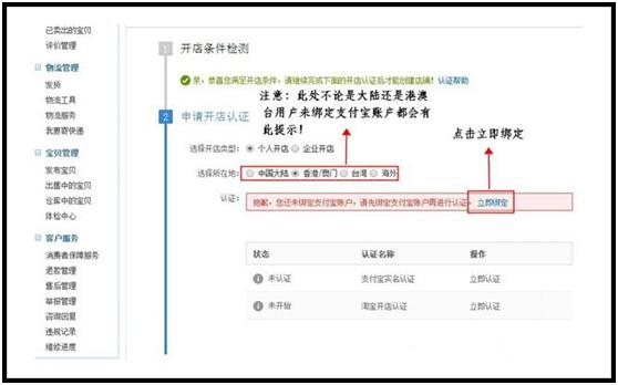 3.如果是在首页直接点击了“免费开店”,进入申请页面后系统首先会检测是否满足开店条件,如果满足条件,则可继续申请,选择开店的类型,如您是个人用户开店(指非公司性质的开店用户),在淘宝账户未绑定淘宝账户时,系统会提示你去绑定支付宝账户,如下图所示,只需点击“立即绑定”: