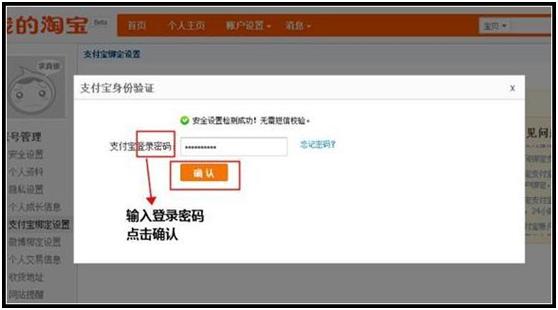 5.输入支付宝账户名后,点击"立即绑定",之后请根据如下页面提示,输入支付宝登录密码后点击"确认: