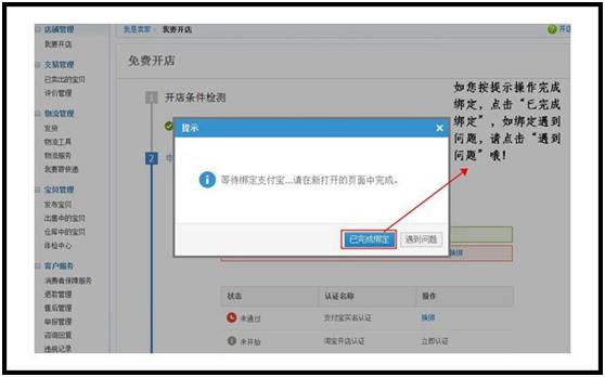7.绑定成功后,需要继续开店的一系列操作,请返回“卖家中心”淘宝开店页面,在页面浮出的窗口中点击“已完成绑定”。