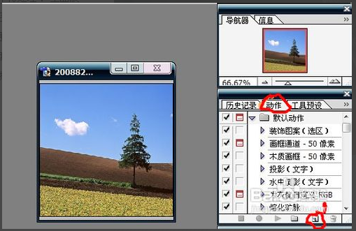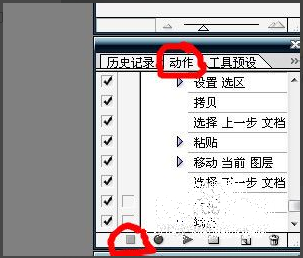 6,关闭“记录”,一个完整的动作已经完成,以后的每张图片只要按照这样处理就可以了,所以现在要关闭“记录途径”。步骤:点击右边的“动作窗口”下面的“第一个方框按钮”。